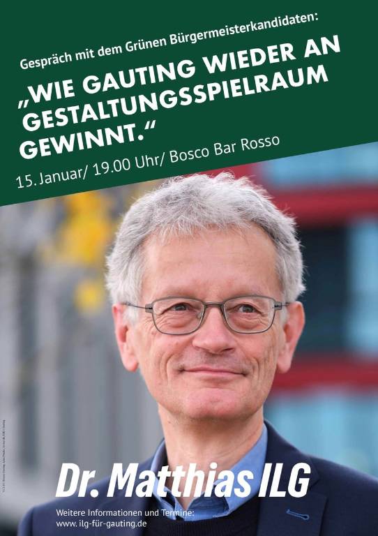 Die Grünen Gauting laden für diesen Donnerstag, 15. Januar, zu einer Info-Veranstaltung mit dem Bürgermeisterkandidaten Dr. Matthias Ilg. Der Titel: „Wie Gauting wieder an Gestaltungsspielraum gewinnt.“ Die Handlungsmöglichkeiten der Gemeinde werden wegen steigender Ausgaben und stagnierender Einnahmen von Jahr zu Jahr geringer. Die Konsequenz: